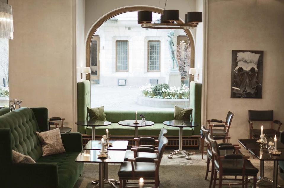 Before we even get to the admirable Art Nouveau elements and the serious art collection, let’s head straight up. Fans of swell old-timey birdcage elevators will be riding to heaven as they ascend the six-story Hotel Diplomat on Stockholm’s Strandvägen bayfront boulevard in the Östermalm district.