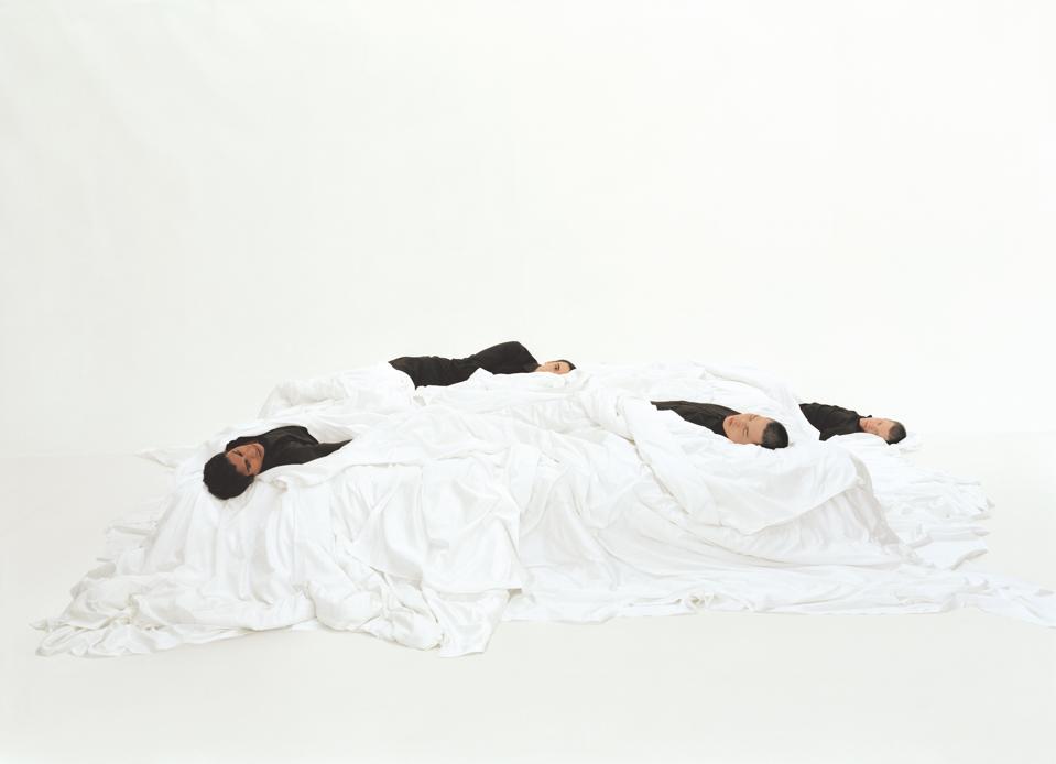 In Malmö native Maria Friberg’s first-floor work Embedded (2006, video still, c-print, silicone, glass), dark-clad figures lie on and are partly wrapped in stark white sheets. Per the exhibition catalogue, “The men in the “embedded” images move slowly, like icebergs floating on the horizon. They are half awake, half asleep.“ At once peaceful, the images are eerie in their artificialness.