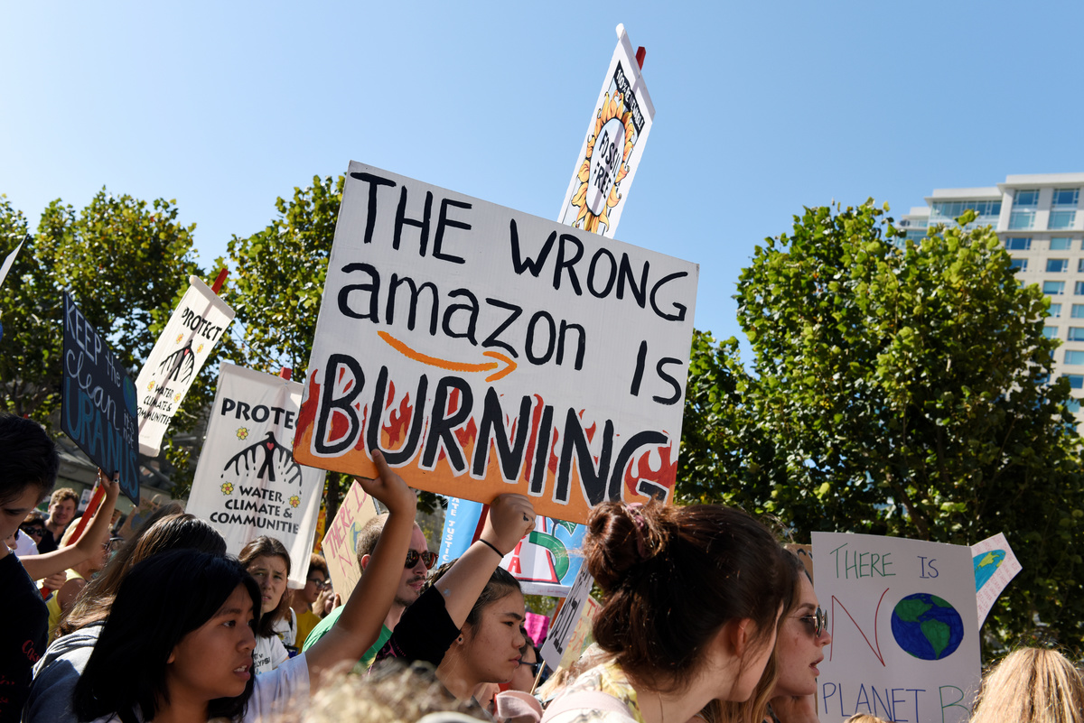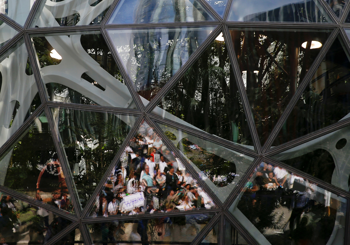 "Amazon, let’s raise the bar not the temperature," read one protester's sign outside the glass domes at Amazon's headquarters in Seattle known as the Spheres, local symbols of the industry's wealth.