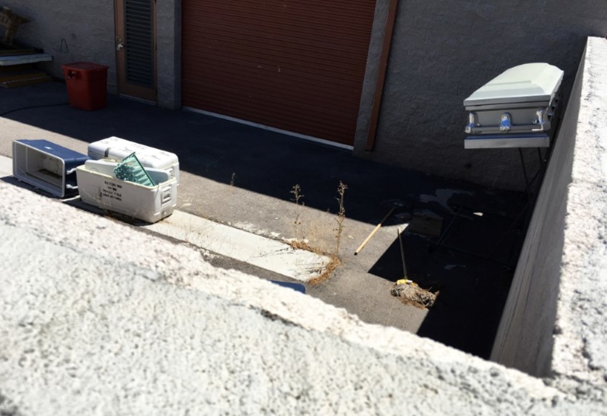 Seven months after health officials inspected the place, the courtyard remained littered with empty coolers bearing Southern Nevada’s initials. Nearby stood a rusted kiln, a pair of filthy mops and a gunmetal grey coffin, broiling in the desert sun.