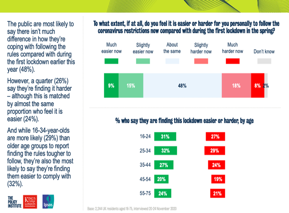 But while most people show little sign of reduced compliance, a notable minority have had a very different experience: one in six admit they’ve not been as careful in obeying the rules, and one in four say they’ve found it tougher to follow them recently.