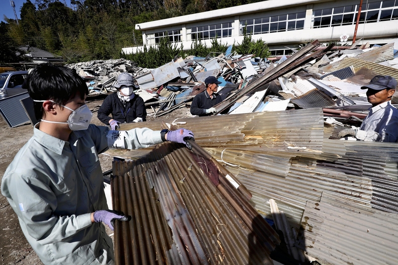 More than 2,300 houses were damaged in Minamiboso in the prefecture. Three collection points that were temporarily established in the city have accepted debris equivalent to that carried by about 17,000 vehicles. At one of the sites, the former Heguri Elementary School, more than 10 vehicles carrying trash were seen lined up before the site opened at 9 a.m. The school grounds were packed with tiles, corrugated metal and tatami mats. Some piles were more than five meters high.