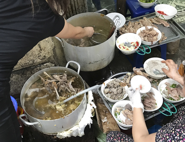 Every day in this Hanoi alleyway, a 50-something woman sits on a tiny stool in front of a boiling vat of duck soup. She cuts the duck meat into small pieces with a scissors, dishing it all into bowls sold for $2 to an endless line of customers.
