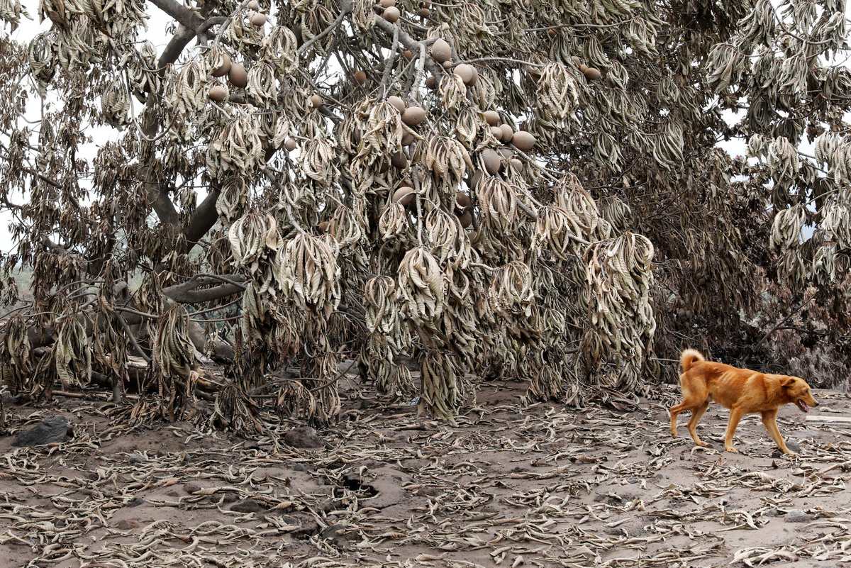 A dog walks past trees covered with ash after the eruption of the Fuego volcano in San Miguel Los Lotes in Escuintla, Guatemala, June 8, 2018. REUTERS/Carlos Jasso