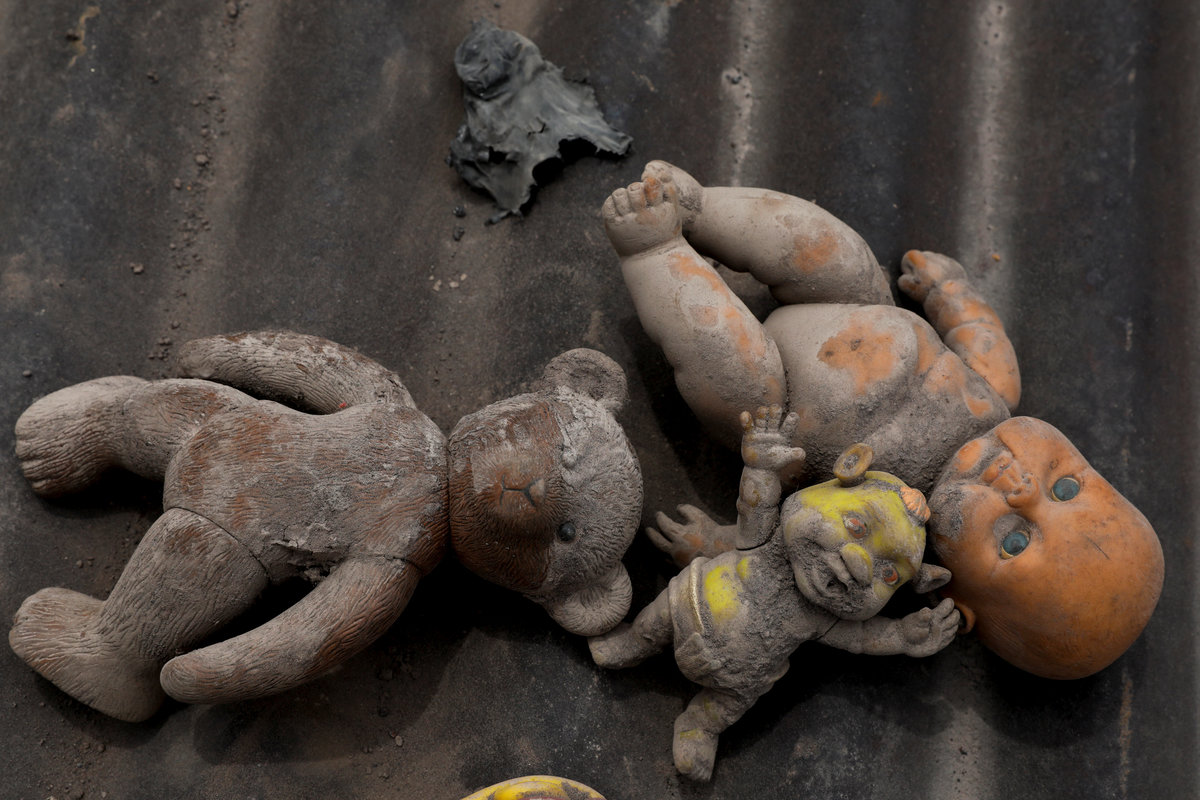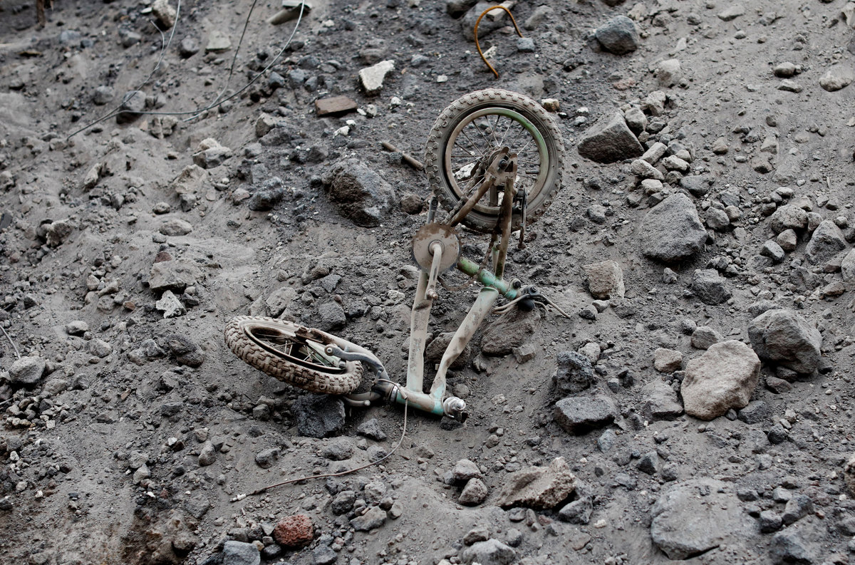 A car is seen covered in ash after the eruption of the Fuego volcano at San Miguel Los Lotes in Escuintla, Guatemala, June 10, 2018. REUTERS/Carlos Jasso Wood covered with ash is seen after the eruption of the Fuego volcano at San Miguel Los Lotes in Escuintla, Guatemala, June 8, 2018. REUTERS/Carlos Jasso A burned tree covered with ash stands in an area affected by the eruption of the Fuego volcano at San Miguel Los Lotes in Escuintla, Guatemala, June 6, 2018. REUTERS/Carlos JassoPages of a burned Bible are seen in an area affected by the eruption of the Fuego volcano in San Miguel Los Lotes in Escuintla, Guatemala, June 8, 2018. REUTERS/Carlos Jasso A bicycle covered with ash lies outside a house affected by the eruption of the Fuego volcano at San Miguel Los Lotes in Escuintla, Guatemala, June 6, 2018. REUTERS/Carlos Jasso A house covered with ash is seen after the eruption of the Fuego volcano in San Miguel Los Lotes in Escuintla, Guatemala, June 6, 2018. REUTERS/Carlos Jasso Banana leafs covered with ash are seen in the area affected by the eruption of the Fuego volcano at San Miguel Los Lotes in Escuintla, Guatemala, June 8, 2018. REUTERS/Carlos JassoThe roof of a house covered in ash is seen after the eruption of the Fuego volcano in San Miguel Los Lotes in Escuintla, Guatemala, June 6, 2018. REUTERS/Carlos Jasso A hammock covered with ash hangs afters the eruption of the Fuego volcano in San Miguel Los Lotes in Escuintla, Guatemala, June 6, 2018. REUTERS/Carlos Jasso A terrace of a house is covered with ash after the eruption of the Fuego volcano at San Miguel Los Lotes in Escuintla, Guatemala, June 6, 2018. REUTERS/Carlos Jasso Toys covered with ash lie on top of a roof of a house affected by the eruption of the Fuego volcano at San Miguel Los Lotes in Escuintla, Guatemala, June 8, 2018. REUTERS/Carlos JassoA guitar is seen on top of a roof of a house affected by the eruption of the Fuego volcano at San Miguel Los Lotes in Escuintla, Guatemala, June 8, 2018. REUTERS/Carlos Jasso A drum covered with ash lies outside a house affected by the eruption of the Fuego volcano at San Miguel Los Lotes in Escuintla, Guatemala, June 6, 2018. REUTERS/Carlos Jasso Volcanic rocks are spread around an area that got buried after the eruption of the Fuego volcano at San Miguel Los Lotes in Escuintla, Guatemala, June 6, 2018. REUTERS/Carlos JassoWall decorations covered with ash hang in a house affected by the eruption of the Fuego volcano at San Miguel Los Lotes in Escuintla, Guatemala, June 8, 2018. REUTERS/Carlos JassoBooks and a toy lie on the ground at a house affected by the eruption of the Fuego volcano in San Miguel Los Lotes in Escuintla, Guatemala, June 8, 2018. REUTERS/Carlos Jasso A window of a house is covered with ash after the eruption of the Fuego volcano at San Miguel Los Lotes in Escuintla, Guatemala, June 8, 2018. REUTERS/Carlos Jasso Car radios are covered in ash after the eruption of the Fuego volcano at San Miguel Los Lotes in Escuintla, Guatemala, June 8, 2018. REUTERS/Carlos Jasso A window of a house is covered with ash after the eruption of the Fuego volcano at San Miguel Los Lotes in Escuintla, Guatemala, June 8, 2018. REUTERS/Carlos Jasso A radio covered with ash is seen after the eruption of the Fuego volcano at San Miguel Los Lotes in Escuintla, Guatemala, June 8, 2018. REUTERS/Carlos JassoKitchen shelves are covered with ash after the eruption of the Fuego volcano at San Miguel Los Lotes in Escuintla, Guatemala, June 6, 2018. REUTERS/Carlos Jasso A refrigerator lies inside a kitchen of a house affected by the eruption of the Fuego volcano at San Miguel Los Lotes in Escuintla, Guatemala, June 8, 2018. REUTERS/Carlos Jasso A kitchen of a house is covered in ash after the eruption of the Fuego volcano at San Miguel Los Lotes in Escuintla, Guatemala, June 8, 2018. REUTERS/Carlos Jasso Onions are seen at a house affected by the eruption of the Fuego volcano at San Miguel Los Lotes in Escuintla, Guatemala, June 8, 2018. REUTERS/Carlos JassoA toy covered with ash lies inside a house affected by the eruption of the Fuego volcano at San Miguel Los Lotes in Escuintla, Guatemala, June 7, 2018. REUTERS/Carlos Jasso