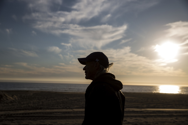 Chris Smith watches ducks land on the lagoon at sunset from his beach encampment, known to locals as Margaritaville.