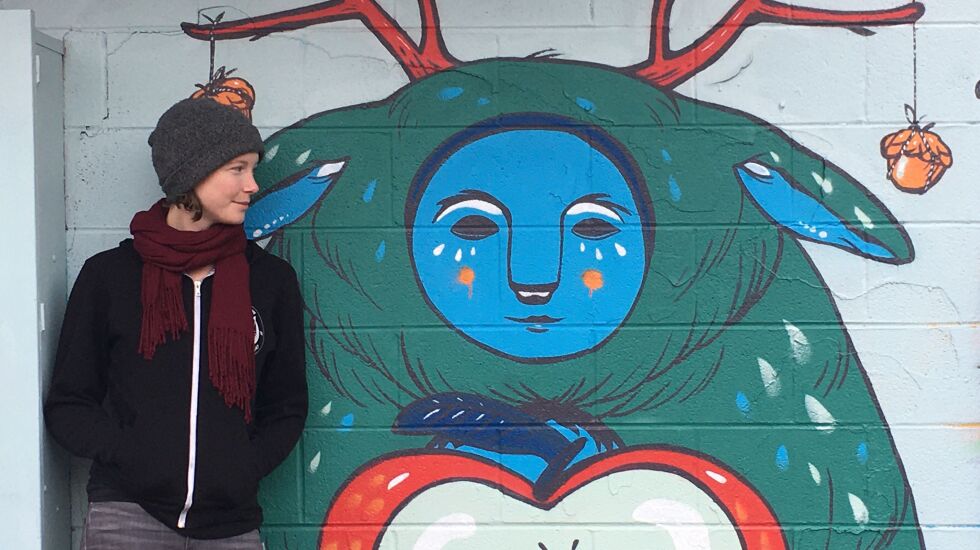 Catherwood, 32, grew up in Crystal Lake. And she sees nature as her “comfort place.” So, for a mural she did at 1704 N. Damen Ave. in Wicker Park, she imagined one of them shuttling a half-bird, half-frog creature down from the sky.