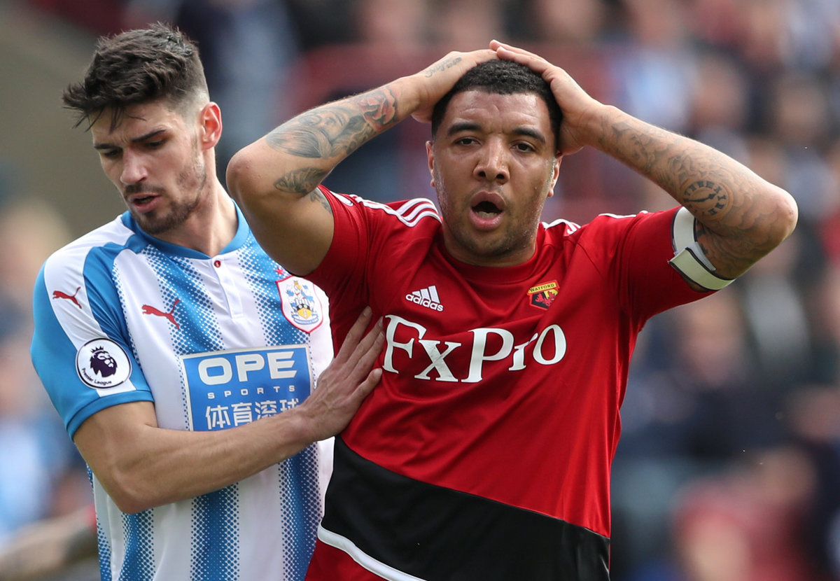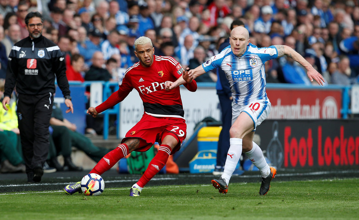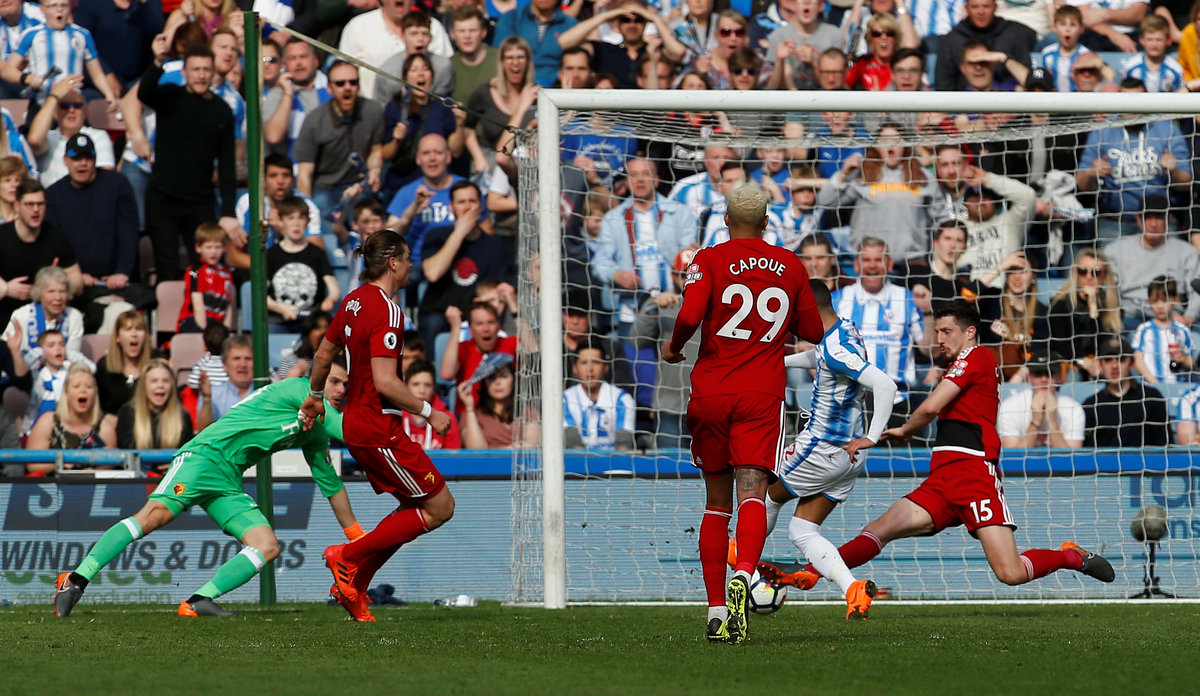 Soccer Football - Premier League - Huddersfield Town vs Watford - John Smith's Stadium, Huddersfield, Britain - April 14, 2018 Watford's Troy Deeney reacts next to Huddersfield Town's Christopher Schindler after missing a chance to score REUTERS/Scott Heppell Soccer Football - Premier League - Huddersfield Town vs Watford - John Smith's Stadium, Huddersfield, Britain - April 14, 2018 Huddersfield Town's Tom Ince scores their first goal Action Images via Reuters/Craig Brough Soccer Football - Premier League - Huddersfield Town vs Watford - John Smith's Stadium, Huddersfield, Britain - April 14, 2018 Watford's Etienne Capoue in action with Huddersfield Town's Aaron Mooy Action Images via Reuters/Craig Brough