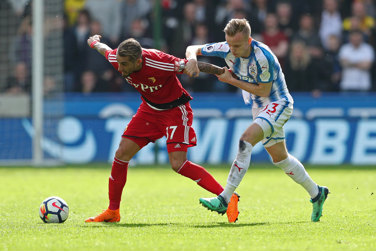 Soccer Football - Premier League - Huddersfield Town vs Watford - John Smith's Stadium, Huddersfield, Britain - April 14, 2018 Watford's Roberto Pereyra in action with Huddersfield Town's Florent Hadergjonaj REUTERS/Scott Heppell