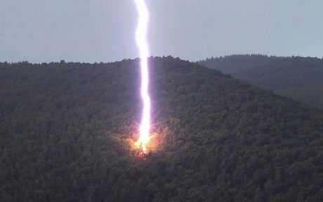The bolt of lightning can be seen piercing through the sky and igniting the trees on the hillside.