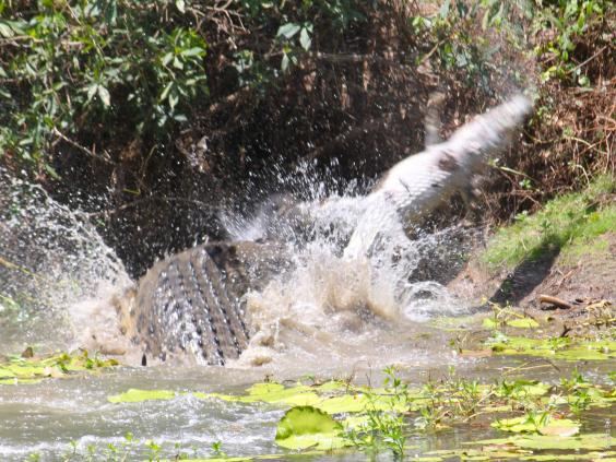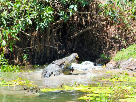 The violent attack shows the smaller crocodile being thrown onto the bank after the larger caught between its powerful jaws.