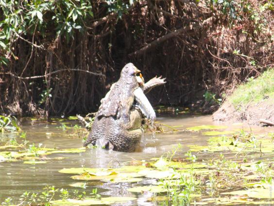 Then the smaller crocodile is eaten whole as the bigger reptile tosses its head back.