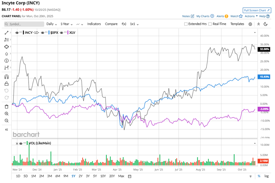 INCY stock has outperformed the S&P 500 Index’s ($SPX) 14.8% gains over the past 52 weeks, with shares up 29.8% during this period. Similarly, it outperformed the Health Care Select Sector SPDR Fund’s (XLV) 5.5% losses over the same time frame.
