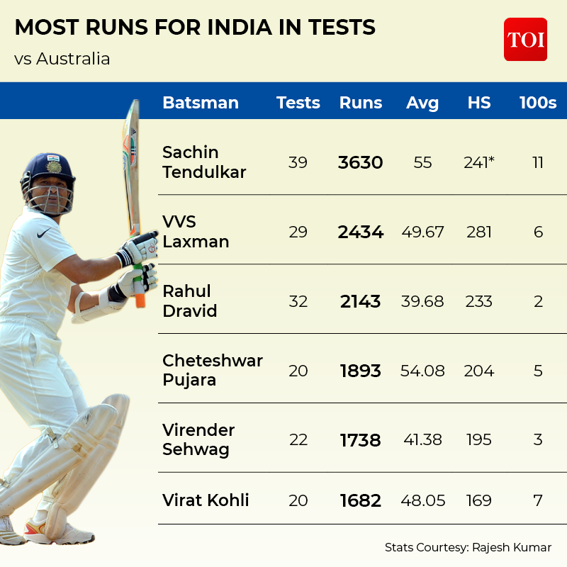 # Cheteshwar Pujara (1893 runs at an average of 54.08, including five hundreds and ten fifties in 20 Tests) needs 107 runs to complete 2,000 runs and to become the fourth Indian batsman after Sachin Tendulkar (3630), VVS Laxman (2434) and Rahul Dravid (2143) to accomplish the feat against Australia in Tests.