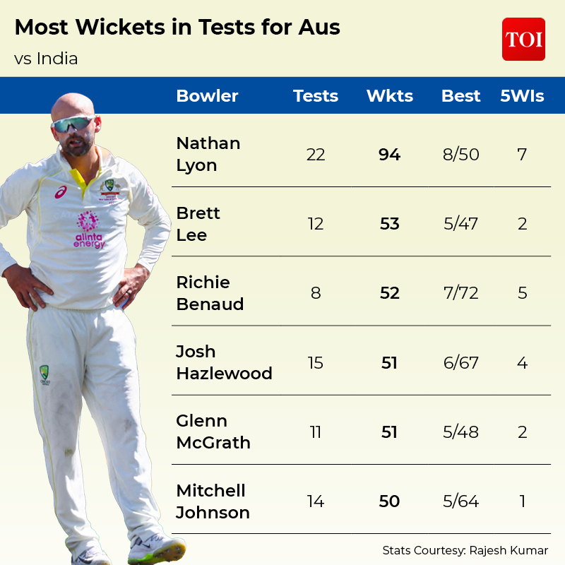# If he takes 6 wickets in the first Test, right arm off spinner, Nathan Lyon (94 at 34.75 in 22 matches) will achieve the distinction of completing 100 wickets in Tests against India. He will be the first Australian bowler and the third overall after England's James Anderson (139 at 24.89 in 35 Tests) and Muttiah Muralidaran (105 at 32.61 in 22) to accomplish this feat against India in Tests.