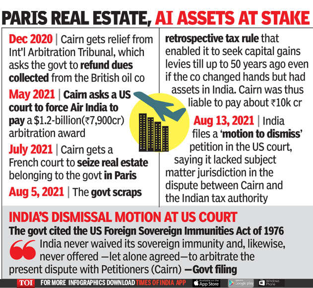 NEW DELHI: The Indian government has asked a court in Washington to dismiss Britain's Cairn Energy suit seeking enforcement of a $1.2 billion arbitral award, saying it had sovereign immunity under US law.