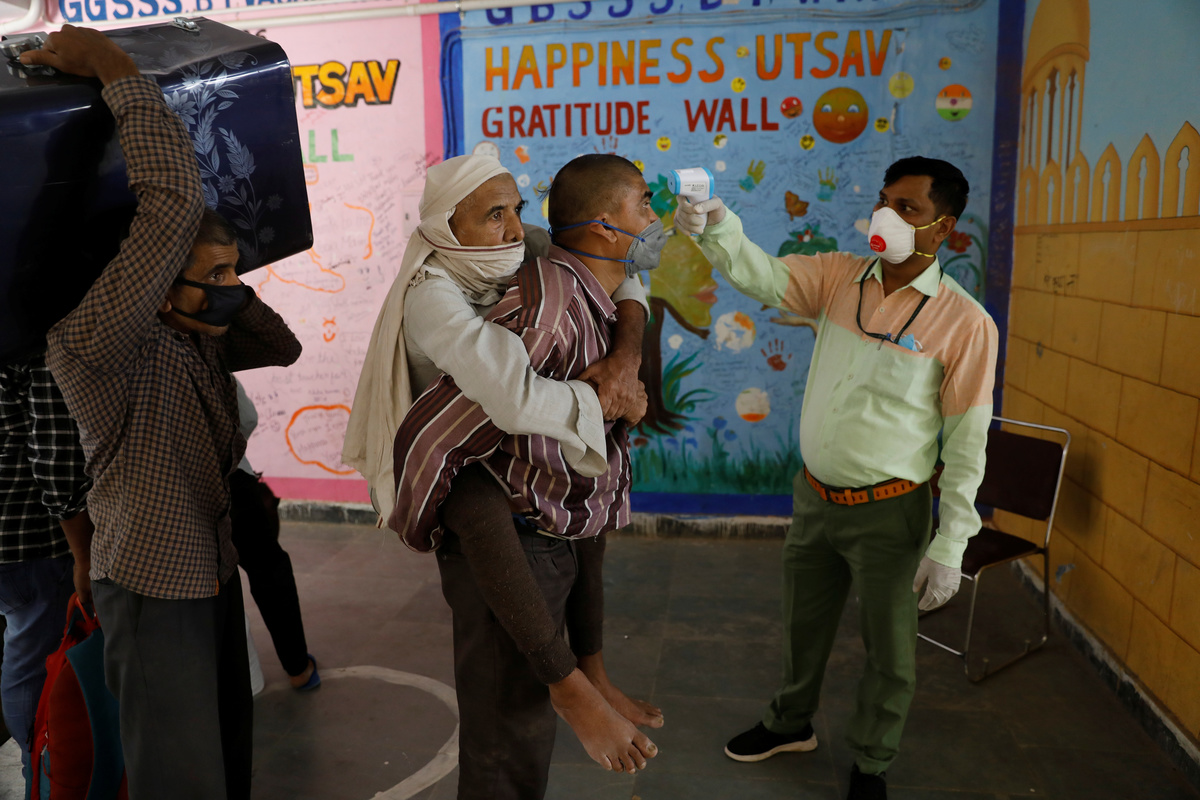 A migrant worker carrying his father on his back has his temperature checked before getting themselves registered for a train to their home state of Uttar Pradesh, during an extended lockdown to slow the spreading of the coronavirus disease (COVID-19), in New Delhi, India, May 26, 2020. REUTERS/Adnan Abidi