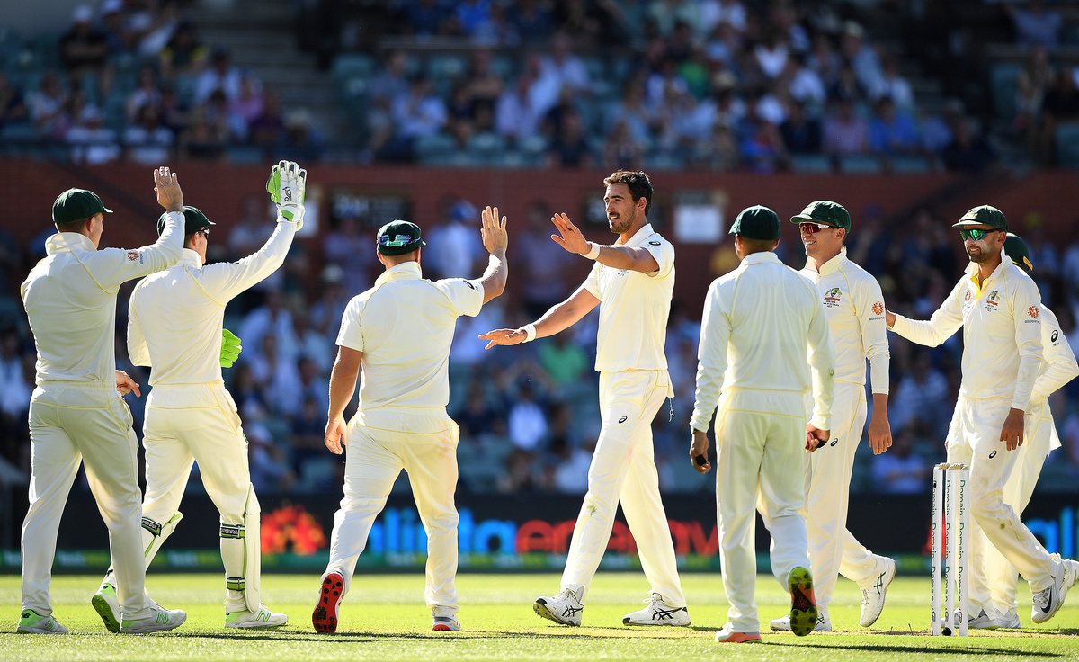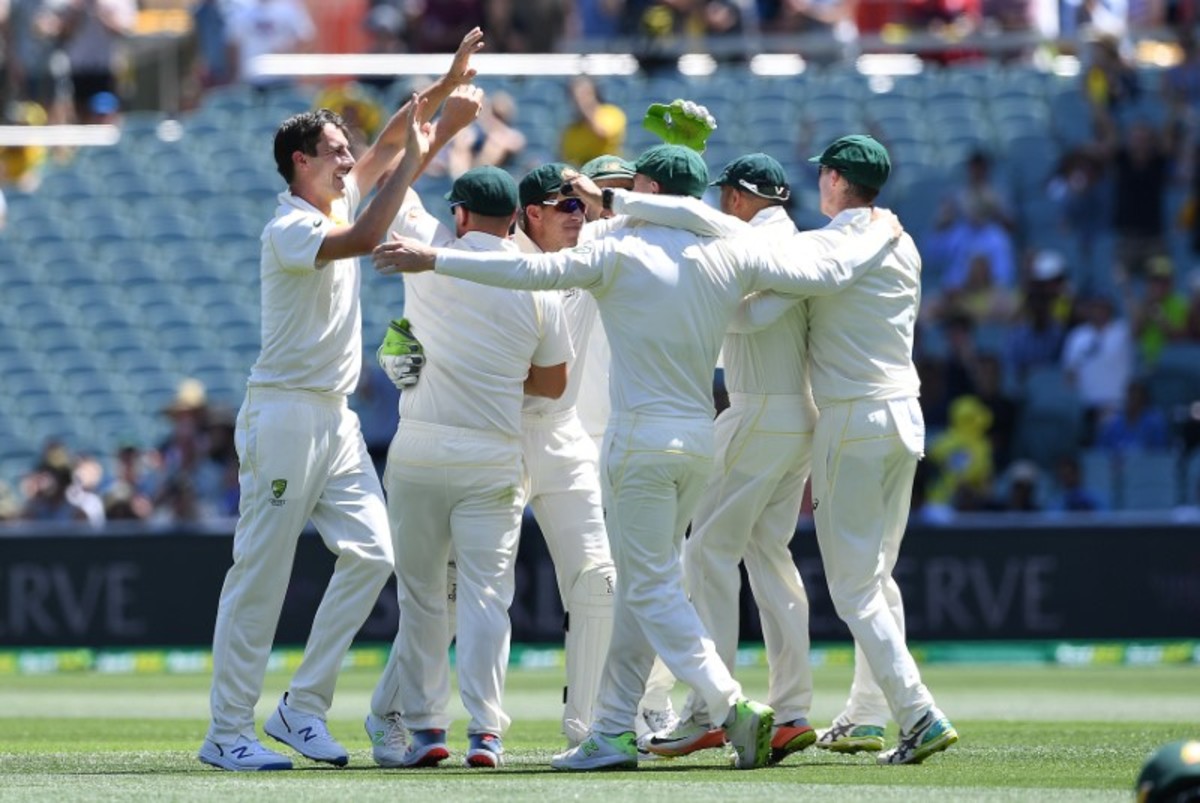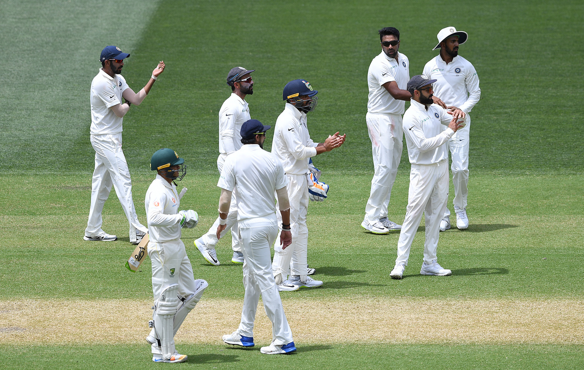 India's captain Virat Kohli (2nd R) celebrates with his teammate Jasprit Bumrah (2nd L) after Bumrah dismissed Australian batsman Peter Handscomb for 34 runs on day two of the first test match between Australia and India at the Adelaide Oval in Adelaide, Australia, December 7, 2018. AAP/Dave Hunt/via REUTERS India's captain Virat Kohli (L) celebrates with his teammate Ishant Sharma after the dismissal of Australia's captain Tim Paine for 5 runs on day two of the first test match between Australia and India at the Adelaide Oval in Adelaide, Australia, December 7, 2018. AAP/Dave Hunt/via REUTERS India's captain Virat Kohli (2nd R) signals to the umpire for a review to dismiss Australian batsman Usman Khawaja (2nd L) on day two of the first test match between Australia and India at the Adelaide Oval in Adelaide, Australia, December 7, 2018. AAP/Dave Hunt/via REUTERS India's captain Virat Kohli and his teammate Ravichandran Ashwin celebrate the dismissal of Australia's Marcus Harris during day two of the first test match between Australia and India at the Adelaide Oval in Adelaide, Australia, December 7, 2018. AAP/David Mariuz/via REUTERS Australia's Marcus Harris leaves the field after being dismissed by India's Ravichandran Ashwin during day two of the first test match between Australia and India at the Adelaide Oval in Adelaide, Australia, December 7, 2018. AAP/Dave Hunt/via REUTERS Australia's bowler Pat Cummins (L) celebrates with his teammates after dismissing India's captain Virat Kohli (not pictured) for 3 runs during day one of the first test match between Australia and India at the Adelaide Oval in Adelaide, Australia, December 6, 2018. AAP/Dave Hunt via REUTERS. India's Cheteshwar Pujara looks on as Australia's Nathan Lyon bowls on day one of the first test match between Australia and India at the Adelaide Oval in Adelaide, Australia, December 6, 2018. AAP/Dave Hunt via REUTERS. India's Cheteshwar Pujara is run out on the last ball of the day on day one of the first test match between Australia and India at the Adelaide Oval in Adelaide, Australia, December 6, 2018. AAP/Dave Hunt via REUTERS. Australia's Mitchell Starc (C) celebrates after taking a wicket during day one of the first test match between Australia and India at the Adelaide Oval in Adelaide, Australia, December 6, 2018. AAP/Dave Hunt/via REUTERS.