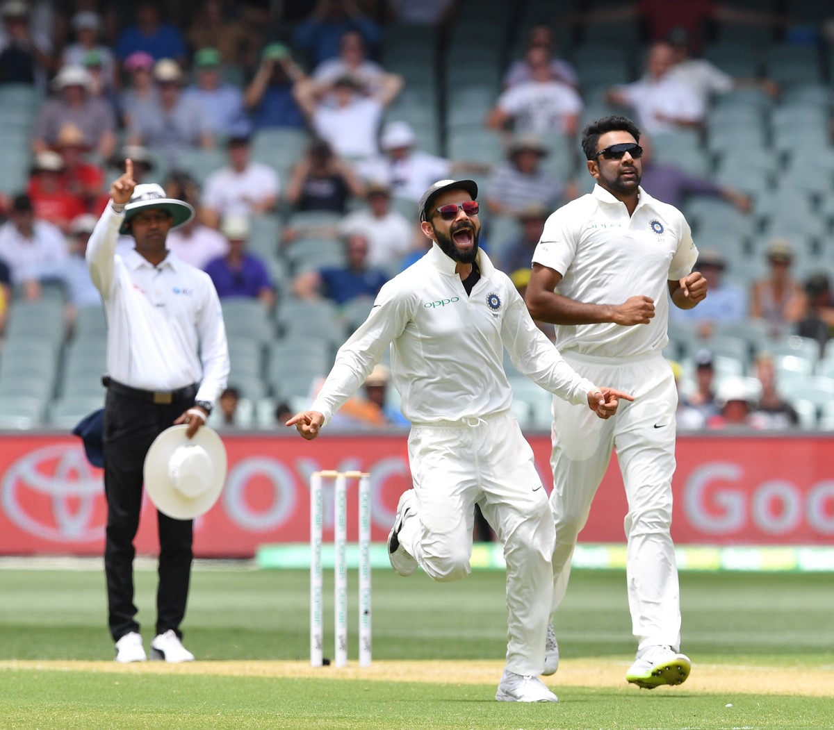 India's captain Virat Kohli reacts to the dismissal of Australian batsman Usman Khawaja who was given out on review from the bowling of Ravichandran Ashwin on day two of the first test match between Australia and India at the Adelaide Oval in Adelaide, Australia, December 7, 2018. AAP/Dave Hunt/via REUTER