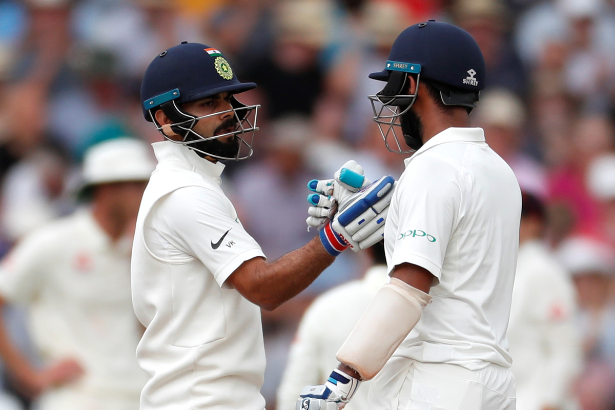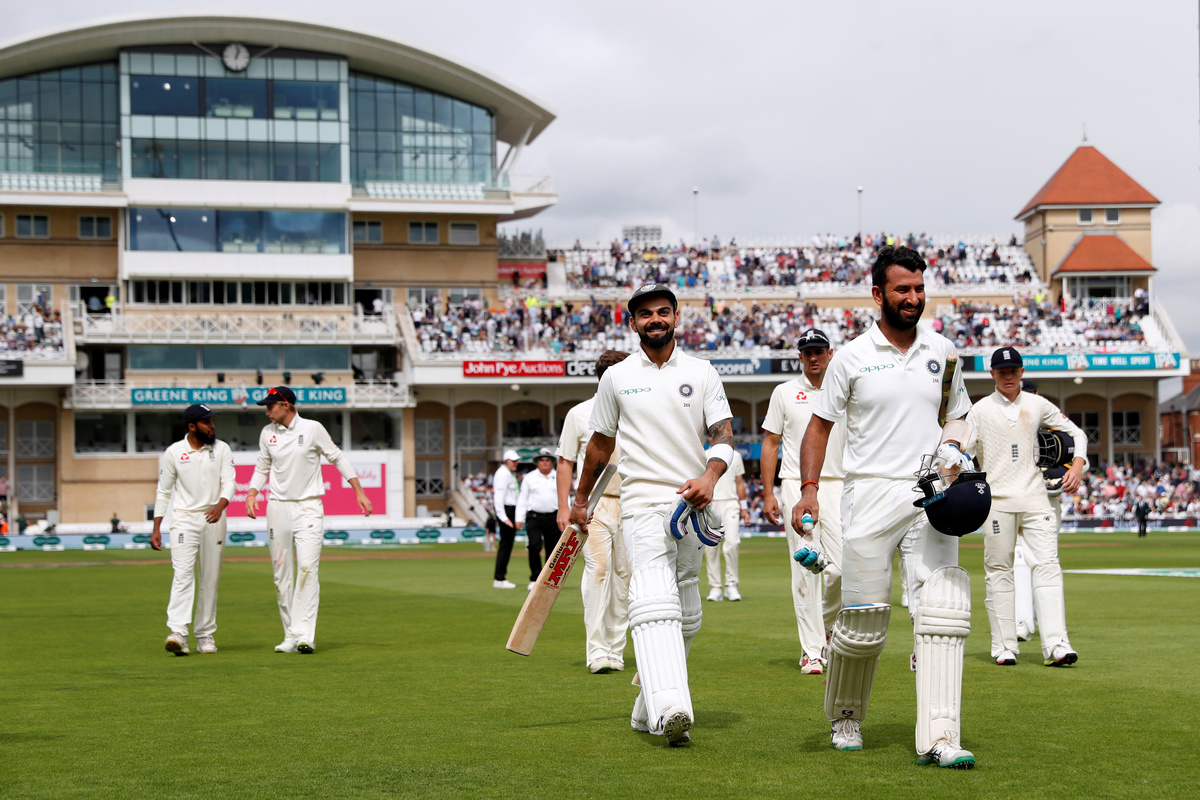 Cricket - England v India - Third Test - Trent Bridge, Nottingham, Britain - August 20, 2018 India's Virat Kohli in action batting Action Images via Reuters/Paul ChildsCricket - England v India - Third Test - Trent Bridge, Nottingham, Britain - August 20, 2018 India's Virat Kohli and Cheteshwar Pujara leave the field for the lunch interval Action Images via Reuters/Paul ChildsCricket - England v India - Third Test - Trent Bridge, Nottingham, Britain - August 20, 2018 England's Jonny Bairstow leaves the field after sustaining an injury Action Images via Reuters/Paul ChildsCricket - England v India - Third Test - Trent Bridge, Nottingham, Britain - August 20, 2018 India's Cheteshwar Pujara in action batting Action Images via Reuters/Paul ChildsCricket - England v India - Third Test - Trent Bridge, Nottingham, Britain - August 20, 2018 England's Joe Root Action Images via Reuters/Paul ChildsCricket - England v India - Third Test - Trent Bridge, Nottingham, Britain - August 20, 2018 India's Virat Kohli celebrates his half century with teammate Cheteshwar Pujara Action Images via Reuters/Paul ChildsCricket - England v India - Third Test - Trent Bridge, Nottingham, Britain - August 20, 2018 England's Ben Stokes reacts Action Images via Reuters/Paul ChildsCricket - England v India - Third Test - Trent Bridge, Nottingham, Britain - August 20, 2018 England's Joe Root and James Anderson Action Images via Reuters/Paul Childs