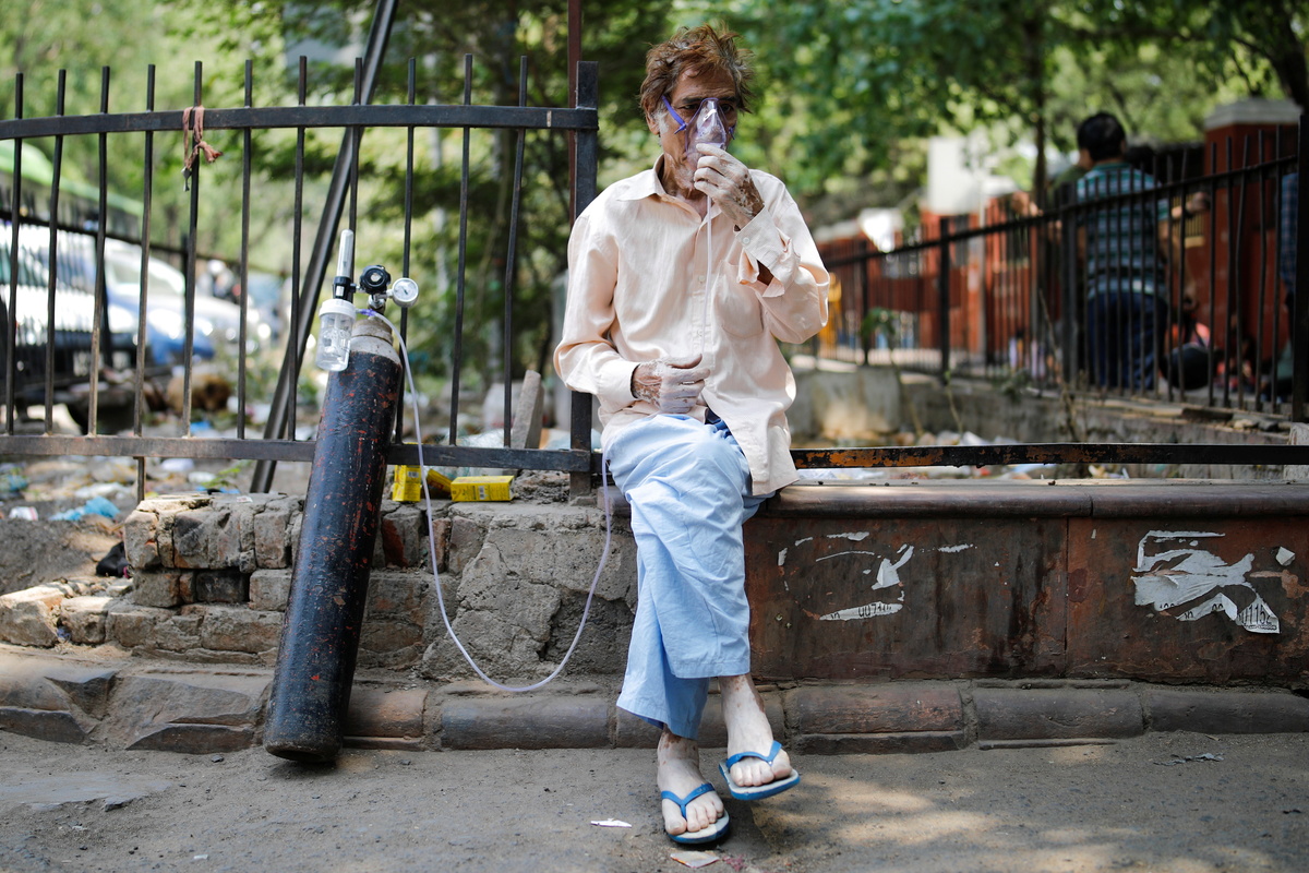 In the western city of Ahmedabad, a man strapped to an oxygen cylinder lay in the back of a car outside a hospital as he waited for a bed.