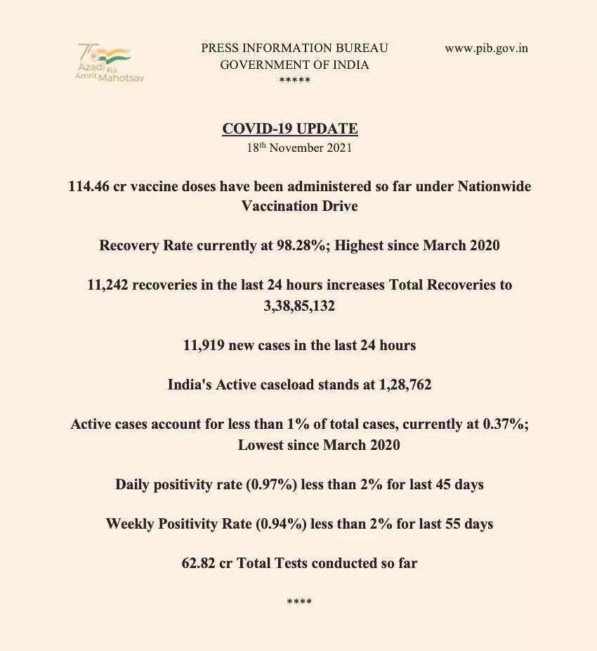 NEW DELHI: India reported 11,919 new Covid-19 cases in the last 24 hours, informed the ministry of health and family welfare on Thursday.