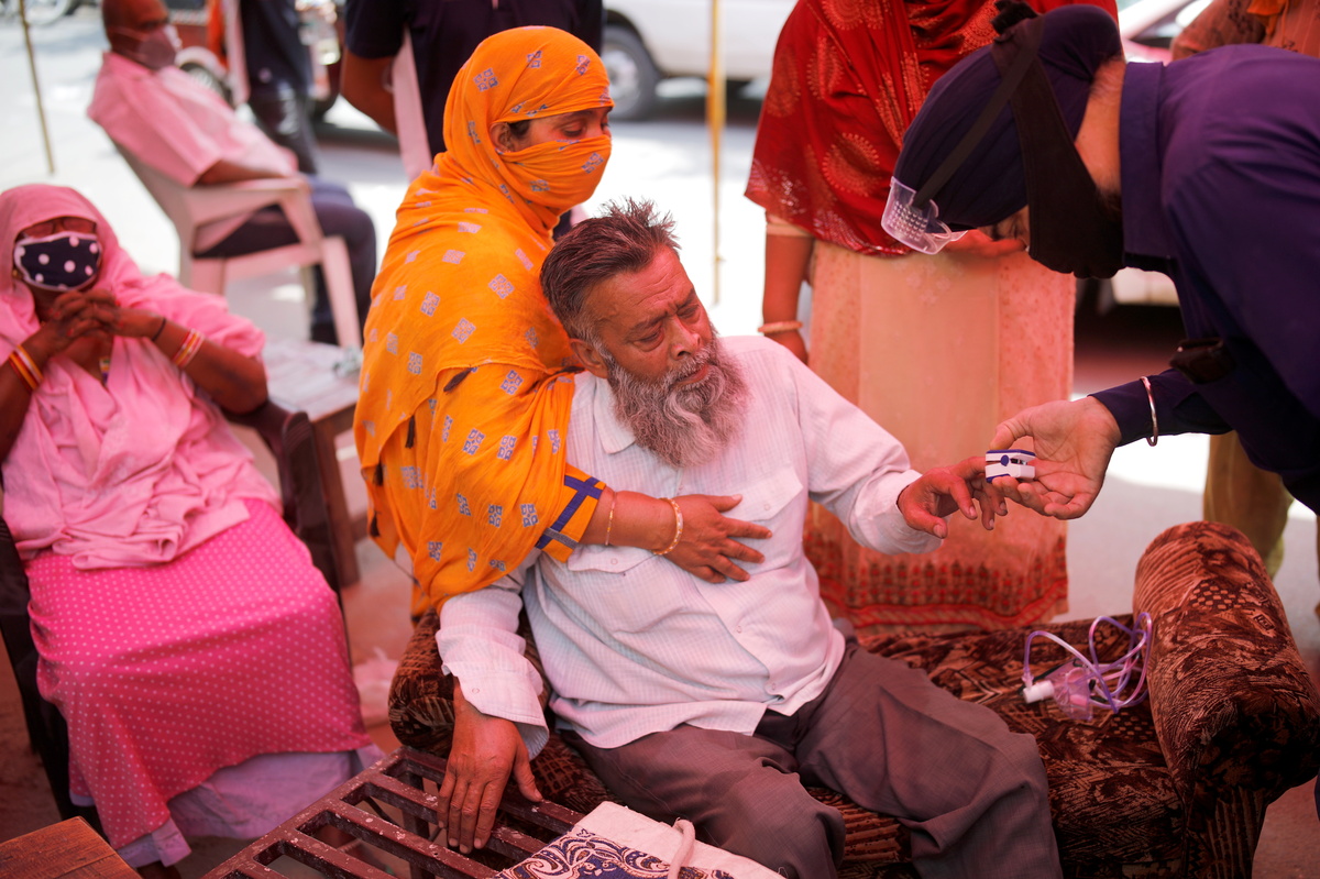 Outside a temple in the capital, New Delhi, Sikh volunteers were providing oxygen to patients lying on benches inside makeshift tents, hooked up to a giant cylinder. Every 20 minutes or so, a new patient came in.