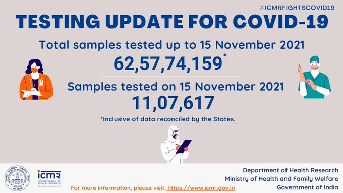 According to the health ministry, a total of 11,07,617 tests were conducted in the last 24 hours. India has so far conducted a total of 62,57,74,159 Covid-19 tests.