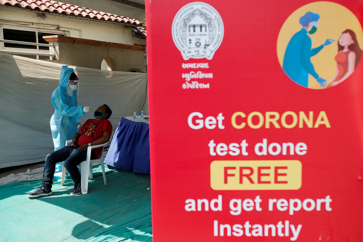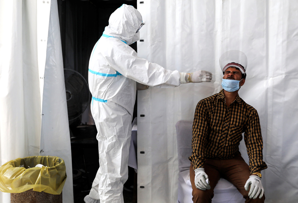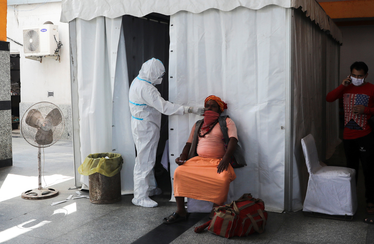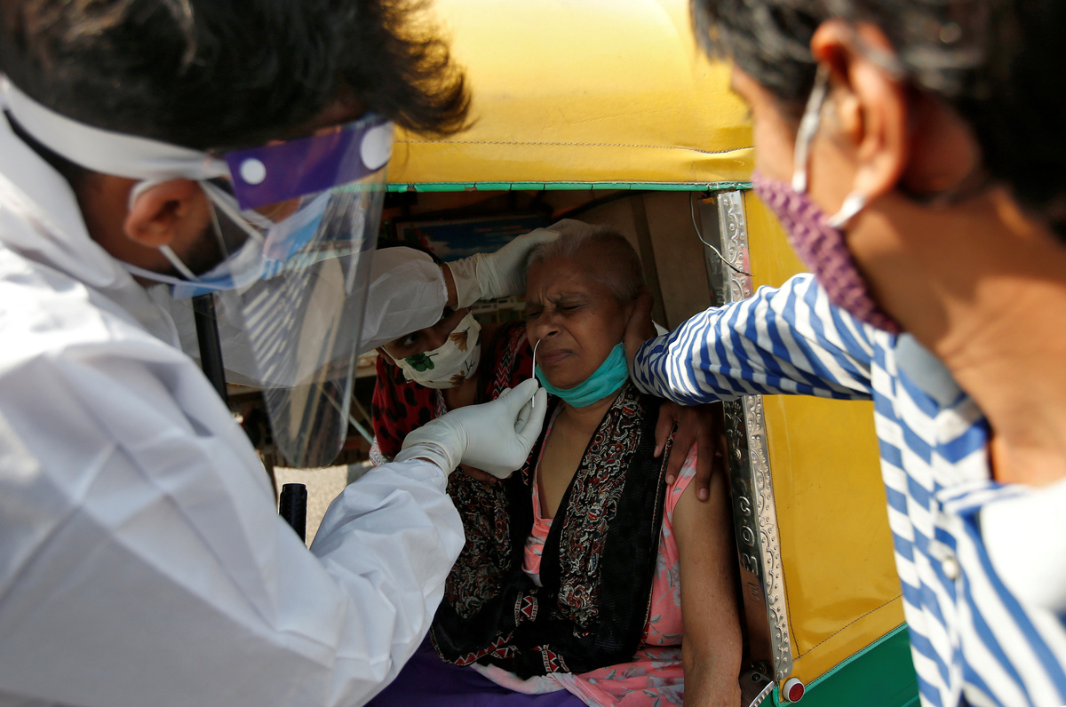 Passengers wearing protective face masks stand in a queue on a platform to get tested for the coronavirus disease (COVID-19), at a railway station, in New Delhi, India, October 5, 2020. REUTERS/Anushree FadnavisA woman sitting in an autorickshaw reacts as a healthcare worker takes a swab from her for a rapid antigen test in a street, amidst the coronavirus disease (COVID-19) outbreak, in Ahmedabad, India, October 5, 2020. REUTERS/Amit DaveA healthcare worker wearing personal protective equipment (PPE) collects a swab sample from a Sadhu or a Hindu holy man on a platform of a railway station, amidst the spread of the coronavirus disease (COVID-19), in New Delhi, India, October 5, 2020. REUTERS/Anushree Fadnavis