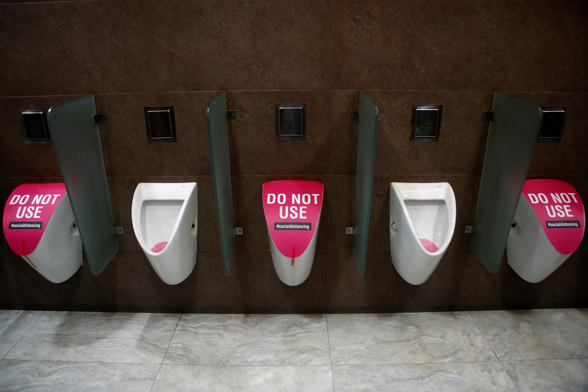 A waiter walks past tables that have been blocked to maintain social distancing at restaurant after they reopened amidst the spread of the coronavirus disease (COVID-19) in Mumbai, India, October 8, 2020. REUTERS/Francis MascarenhasUrinals are blocked to maintain social distancing at a toilet inside a shopping mall amidst the spread of the coronavirus disease (COVID-19) in Mumbai, India, October 8, 2020. REUTERS/Francis MascarenhasA worker cleans a swimming pool before it is reopened for athletes, amidst the coronavirus disease (COVID-19) outbreak, in Ahmedabad, India, October 8, 2020. REUTERS/Amit Dave
