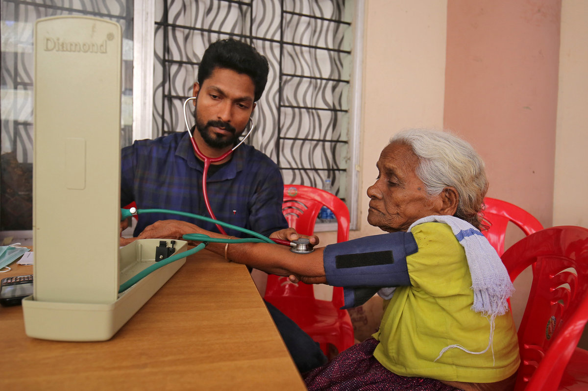 As a helicopter hovered overhead, doctors checked elderly men and women lying on wooden benches in an engineering college.