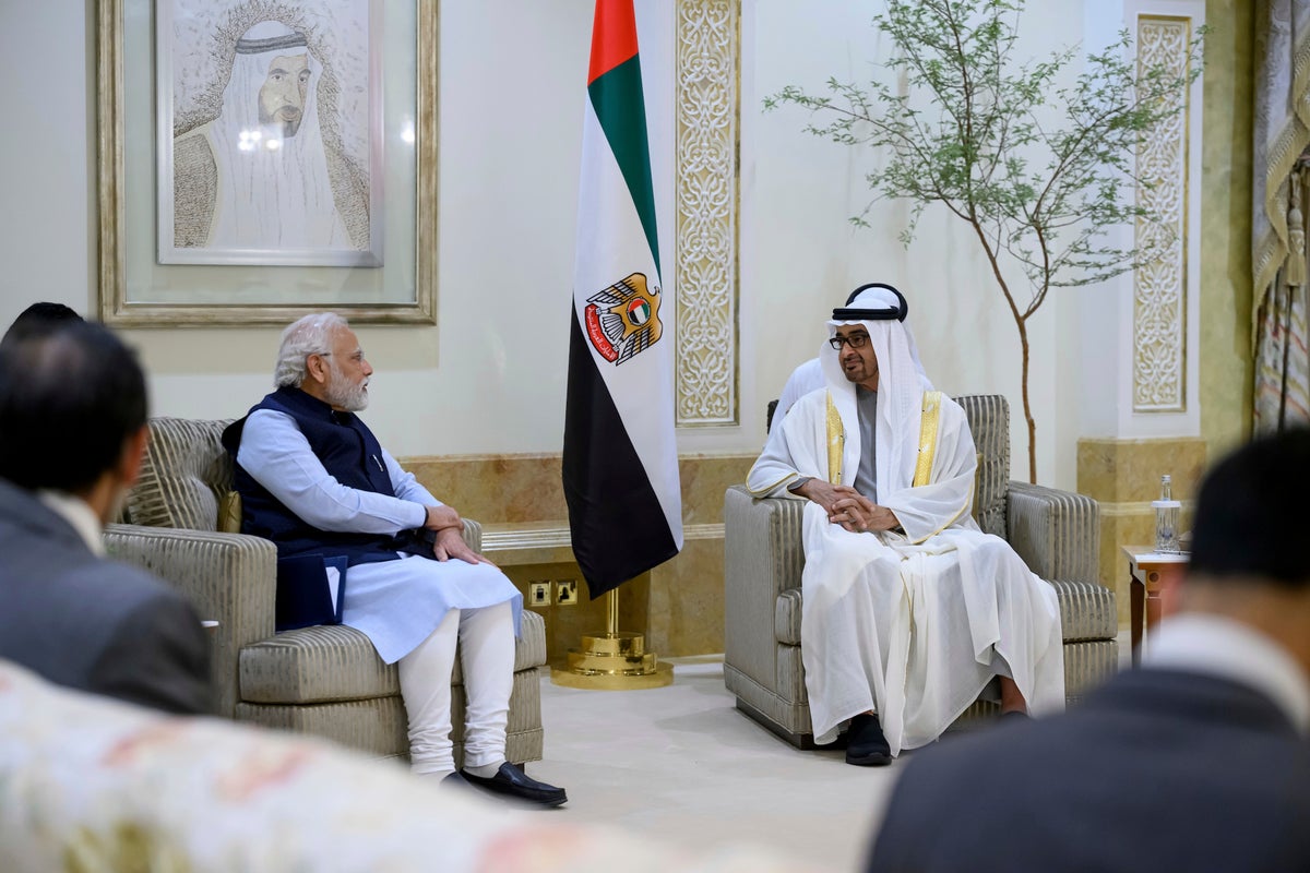 India’s Prime Minister Narendra Modi met with Emirati President Sheikh Mohammed bin Zayed Al Nahyan on a visit to the United Arab Emirates on Tuesday, showcasing deep ties between the major trade partners.
