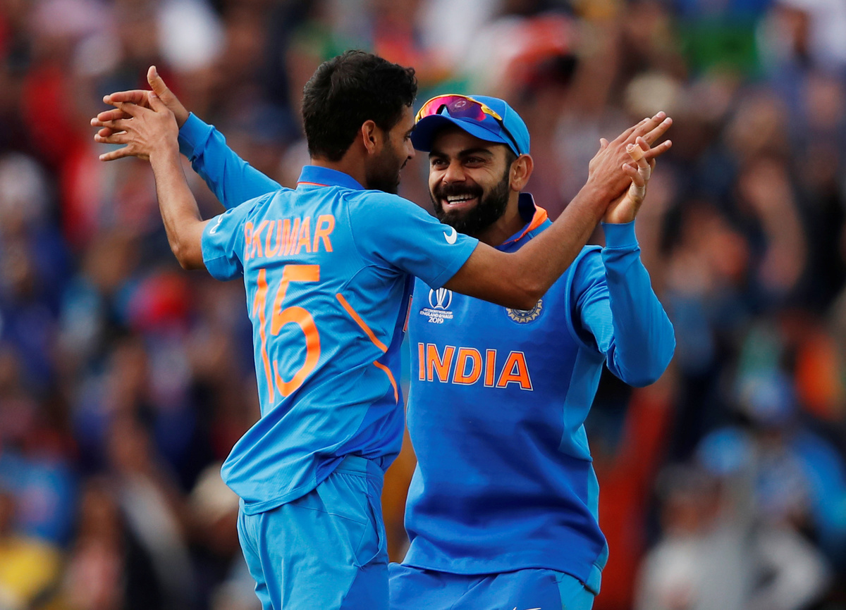 Cricket - ICC Cricket World Cup - India v Australia - The Oval, London, Britain - June 9, 2019 India's Virat Kohli and Bhuvneshwar Kumar celebrate the wicket of Australia's Marcus Stoinis Action Images via Reuters/Andrew Boyers
