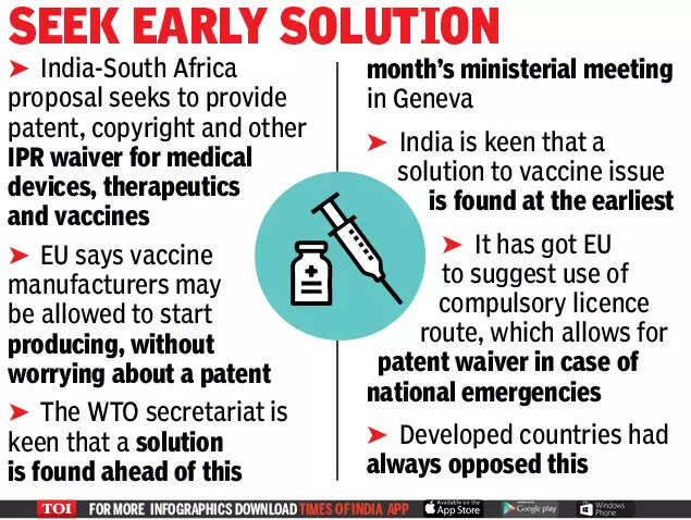 Indian officials told TOI that EU has come to the negotiating table in recent weeks to engage on a possible way out with sources in Geneva indicating that the trading bloc may come around to agreeing to limiting the flexibility to patent waiver only for vaccines.