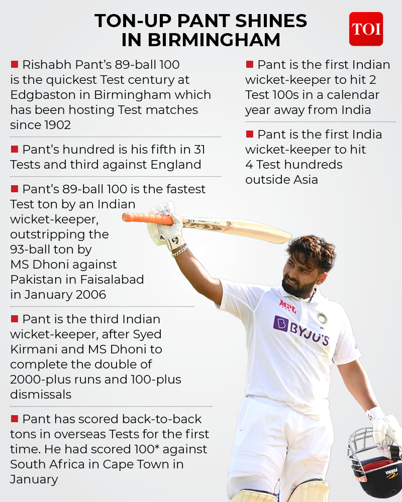 NEW DELHI: Rishabh Pant led Team India's spirited comeback from 98/5 with a blistering hundred on the first day of the rescheduled 5th Test at Edgbaston in Birmingham on Friday.