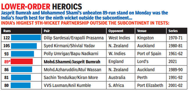 Bumrah and Shami added 89 for the ninth wicket, the highest for that position at Lord’s, beating the 66 between Kapil Dev and Madan Lal in 1982. India’s lower order has contributed the least in terms of runs of all Test teams since 2018. But things seem to be changing.