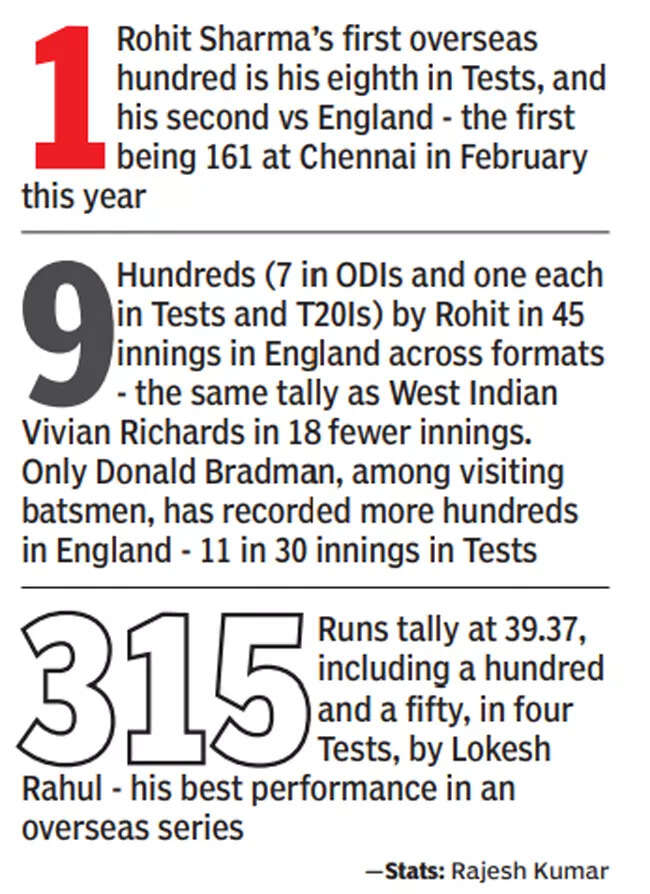 His day began with an exquisite straight drive off Anderson. The century came up with a disdainful six of Moeen, dancing down and carting the spinner over long on. That shot was Rohit exhaling after hours and hours of self-control. This was the moment, at 94, when he let instinct take over!It was the third time he has gone to three figures with a six, but this one was special. By the middle of the third session, Rohit was toying with the likes of Root, opening the face of the bat and timing balls through mid-off. In between, he guided Anderson past mid-wicket for four, slashed and slog-swept Moeen, and punished a stray Overton.