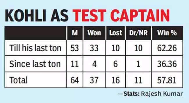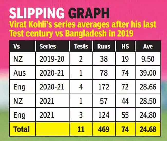 Kohli enjoyed a career-best average of 55.10 after his 81st Test, in which he scored 254 against SA in Oct 2019. Since then, in 14 Tests he has averaged 28.04. Since his last Test ton against Bangladesh at the Eden, he averages 24.68 from 11 Tests.