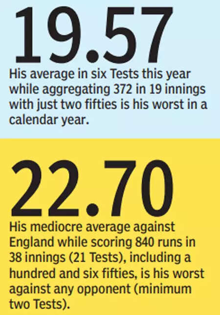 An average of 39.63 for a No. 5 batsman with 78 Tests doesn’t augur well. Worse, that average dips to 22.70 against England. He’s gone without a hundred for 20 innings now.