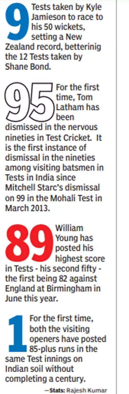 The match came alive when Ravichandran Ashwin got the outside edge of Young’s bat and KS Bharat, substituting for Wriddhiman Saha, grabbed a neat catch behind the stumps. After Young was dismissed for 89 at 151/1, the innings went into a slumber as Latham and Williamson batted the next 19 overs for 46 runs.