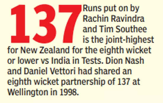 With the Black Caps at 233/7, India pressed hard to wrap up their innings but ran into the resolute Ravindra, who found the perfect foil in Tim Southee (65; 73b; 5x4; 4x6).