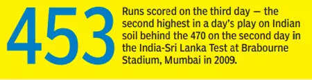 When stumps were drawn, India were 231/3 in 49 overs, 125 runs still in deficit, but the game appeared to have been brought to even keel. India would have been better placed had not Virat Kohli (70; 102b; 8x4; 1x6) been dismissed off the final ball of the day. He looked good for a bigger partnership with Sarfaraz Khan (70; 78b; 7x3; 3x6).