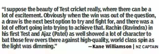 New Zealand skipper Kane Williamson had a sheepish smile while admitting the slowness in the pitch helped them pull off a draw. "The pitch managed to hold on. But only just, as did we," he said while mentioning that his team was constantly navigating to find a way to chase the target down but the pitch made it too difficult.