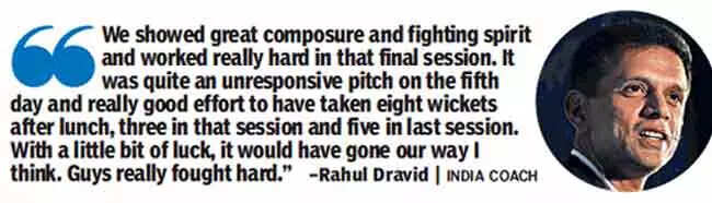 "We showed great composure and fighting spirit and worked really hard in that final session. It was quite an unresponsive pitch on the fifth day and (it was a) really good effort to have taken eight wickets after lunch," India head coach Rahul Dravid said after the day's play.