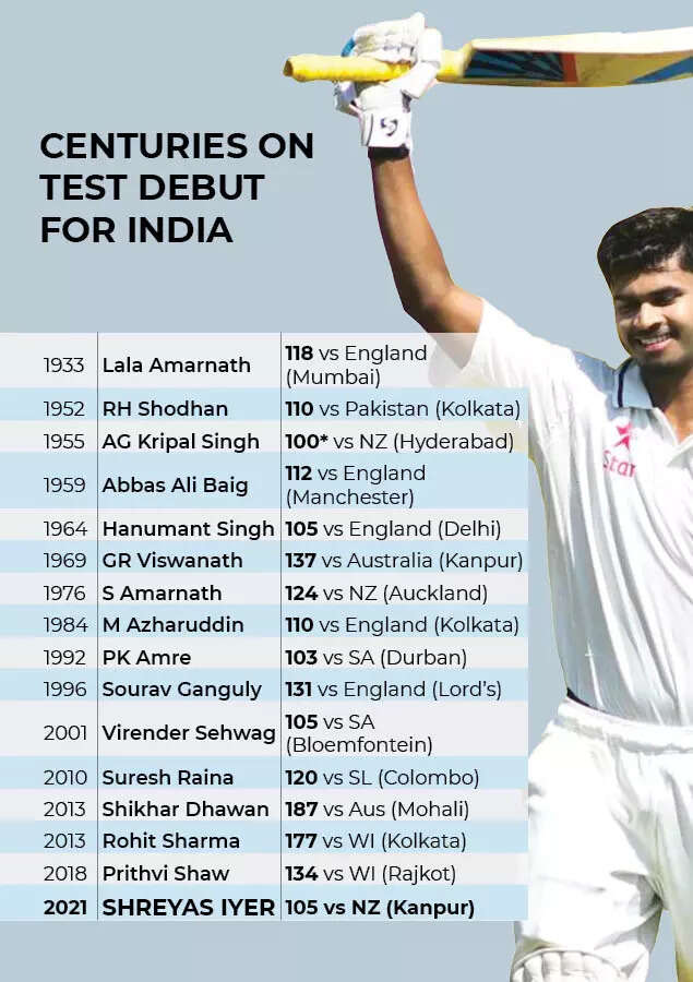 KANPUR: Shreyas Iyer on Friday became the 16th Indian batter to make a hundred on his Test debut, joining an illustrious list which includes the legendary Lala Amarnath, Gundappa Viswanath, and BCCI president Sourav Ganguly among others.