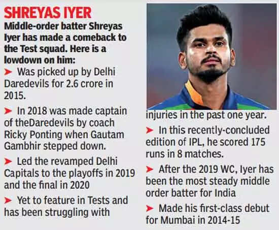 Shreyas Iyer has not played any red-ball cricket for two and a half years. However, TOI has learnt that the selectors and team management is keen to prepare a backup for Pujara and Rahane in the middle-order. Iyer is seen as a potential candidate and this series will give new head coach Rahul Dravid an idea about where Iyer stands in red-ball cricket. There is also a theory that Shubman Gill could also bat in the middle-order in the longest format if the need arises. Gill has had some dominating performances in the middle-order while batting in the middle-order.