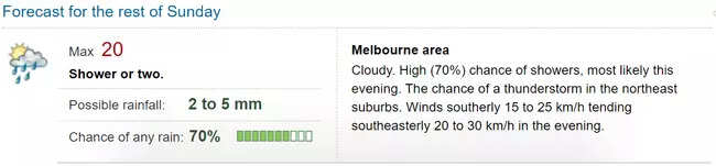 "Cloudy. High (70%) chance of showers, most likely this evening. The chance of a thunderstorm in the northeast suburbs. Winds southerly 15 to 25 km/h tending southeasterly 20 to 30 km/h in the evening."