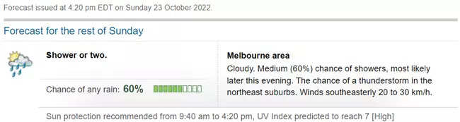 At 8:45 am IST, the Melbourne weather update from the meteorology department in Australia was for "70% chances of showers, most likely this evening".