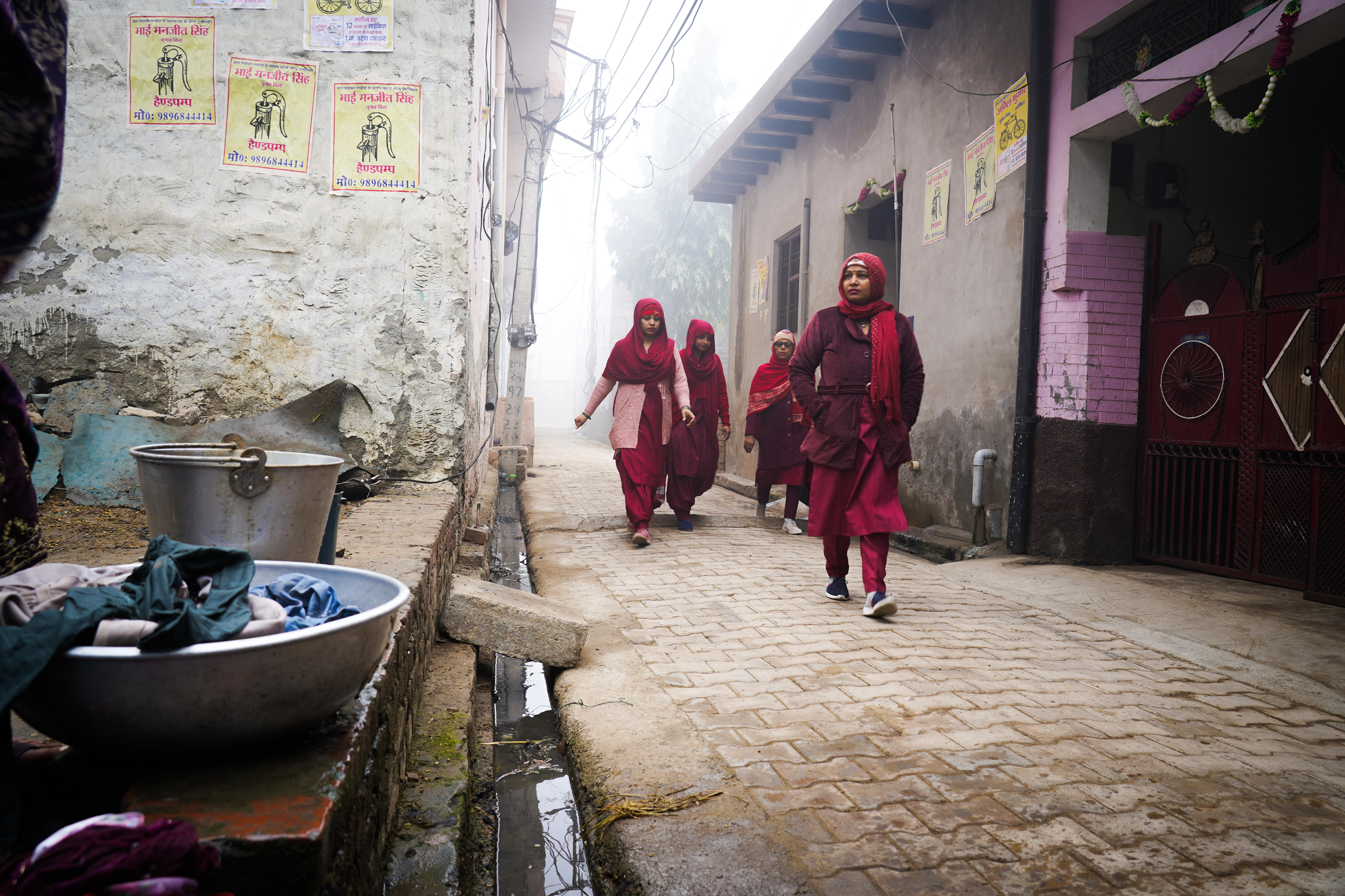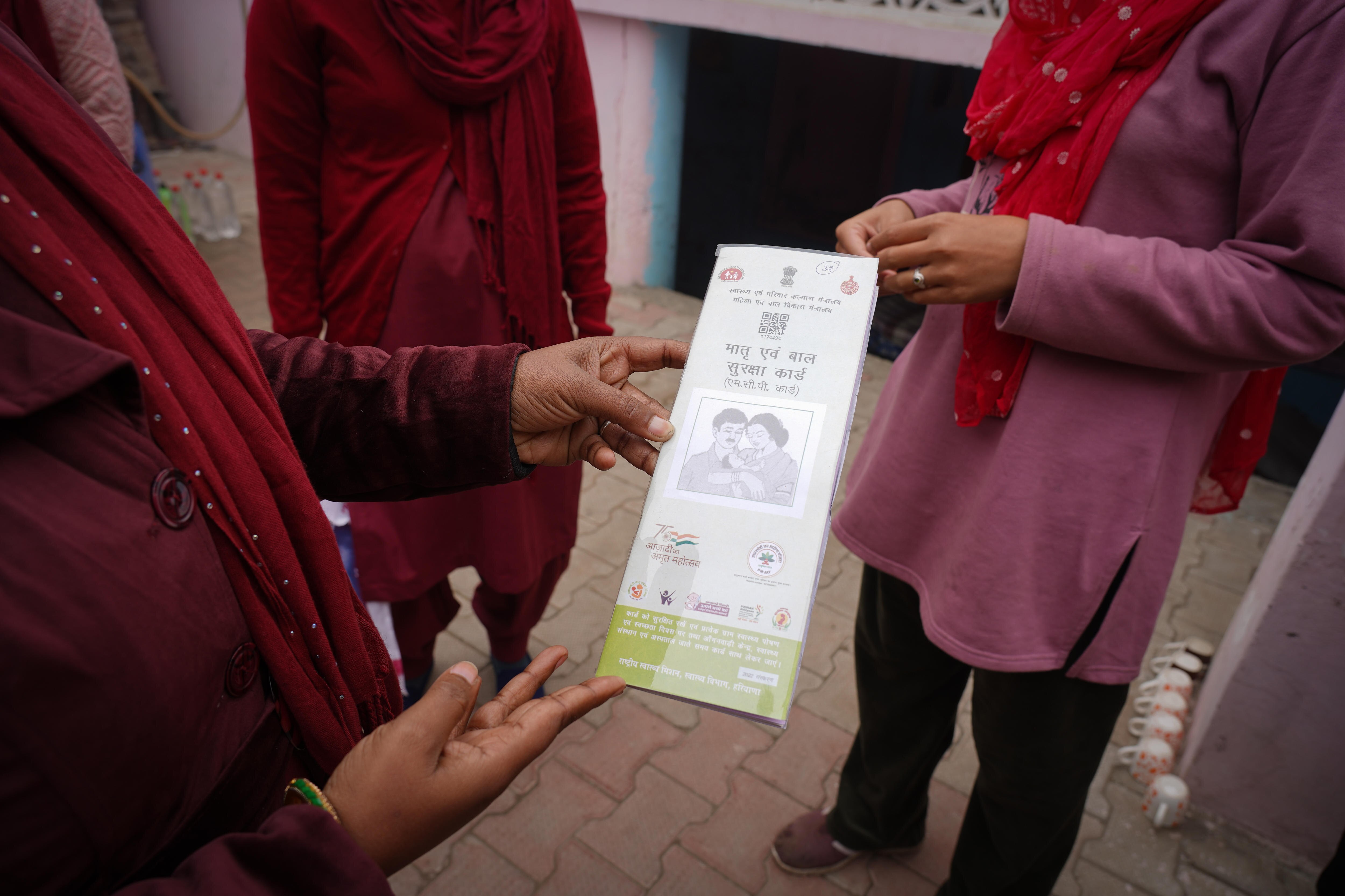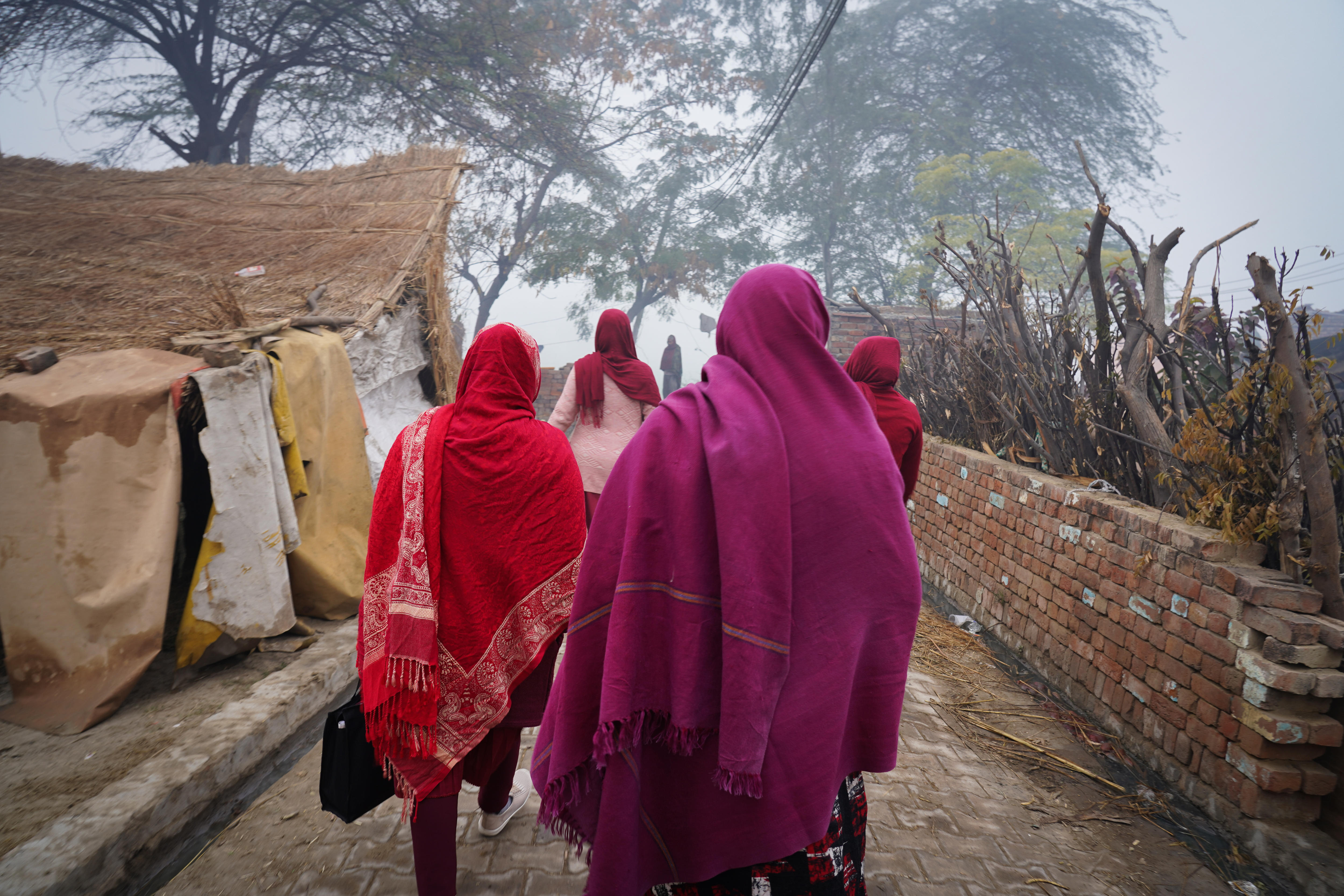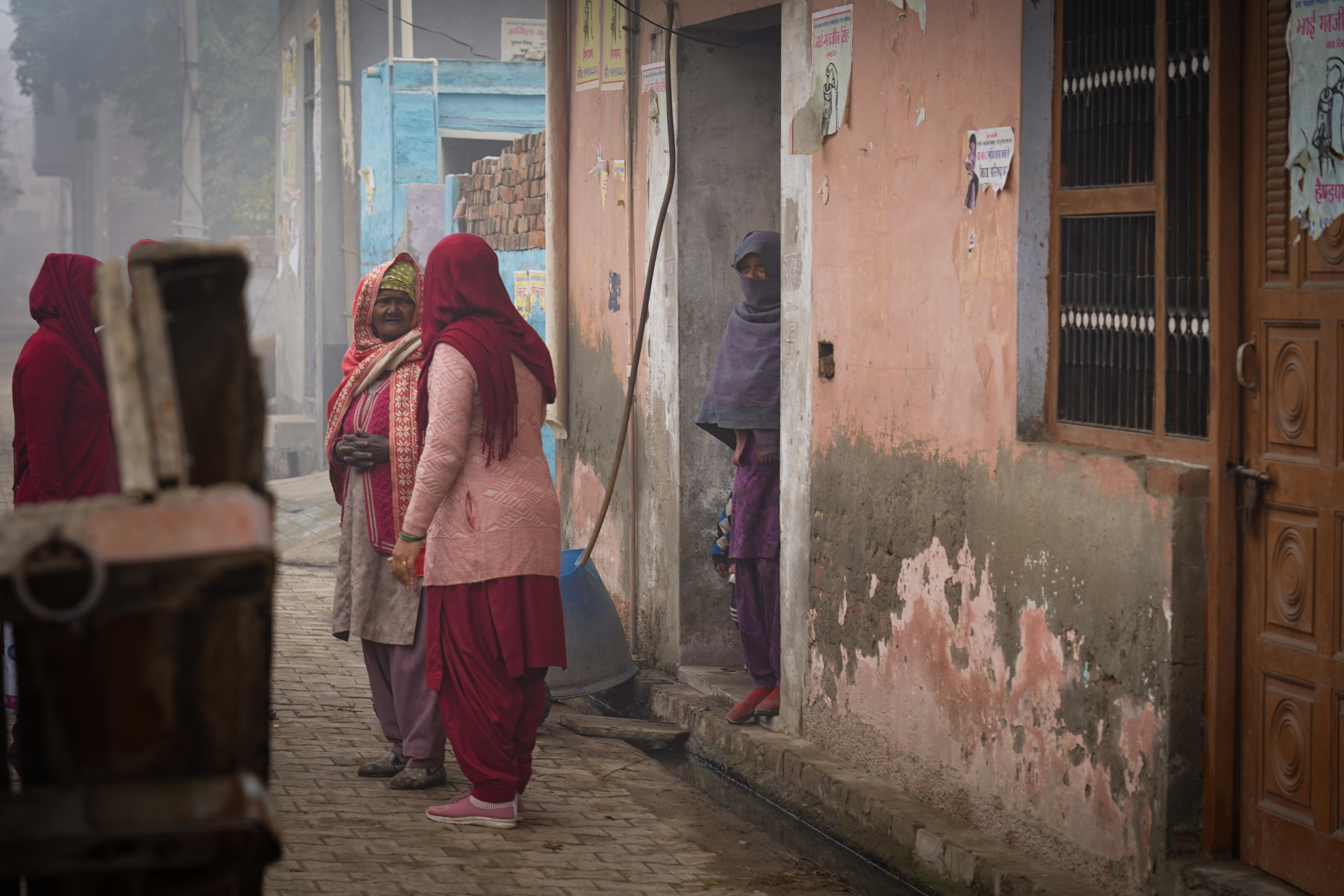 As the morning fog billows through the air, workers in maroon uniforms knock on every door in the village of Mandura, north of Delhi.