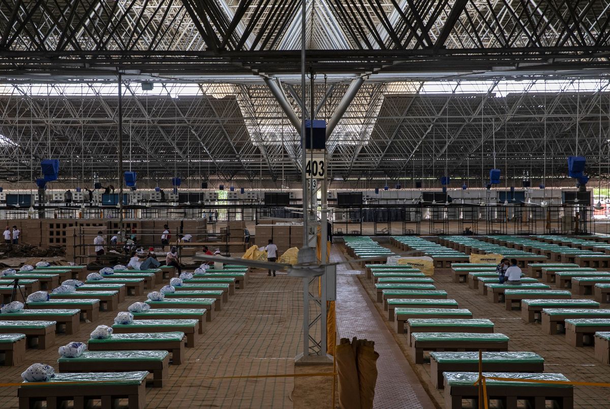 When complete the facility will have capacity for more than 10,000 patients, housed in a vast hangar usually used for lectures given by its spiritual leader.